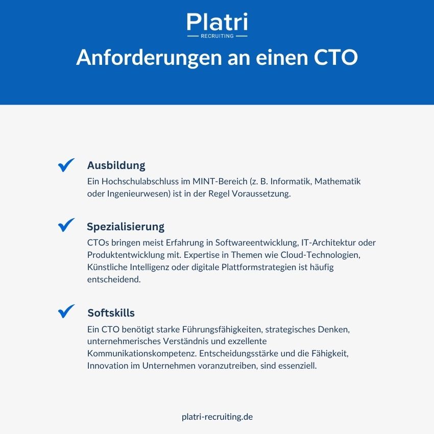 Ein CTO sollte über fundierte technische Kenntnisse, Führungskompetenz, strategisches Denken sowie Kommunikationsstärke verfügen. Kenntnisse in Projektmanagement, agilen Methoden und IT-Sicherheit sind ebenfalls von Vorteil.