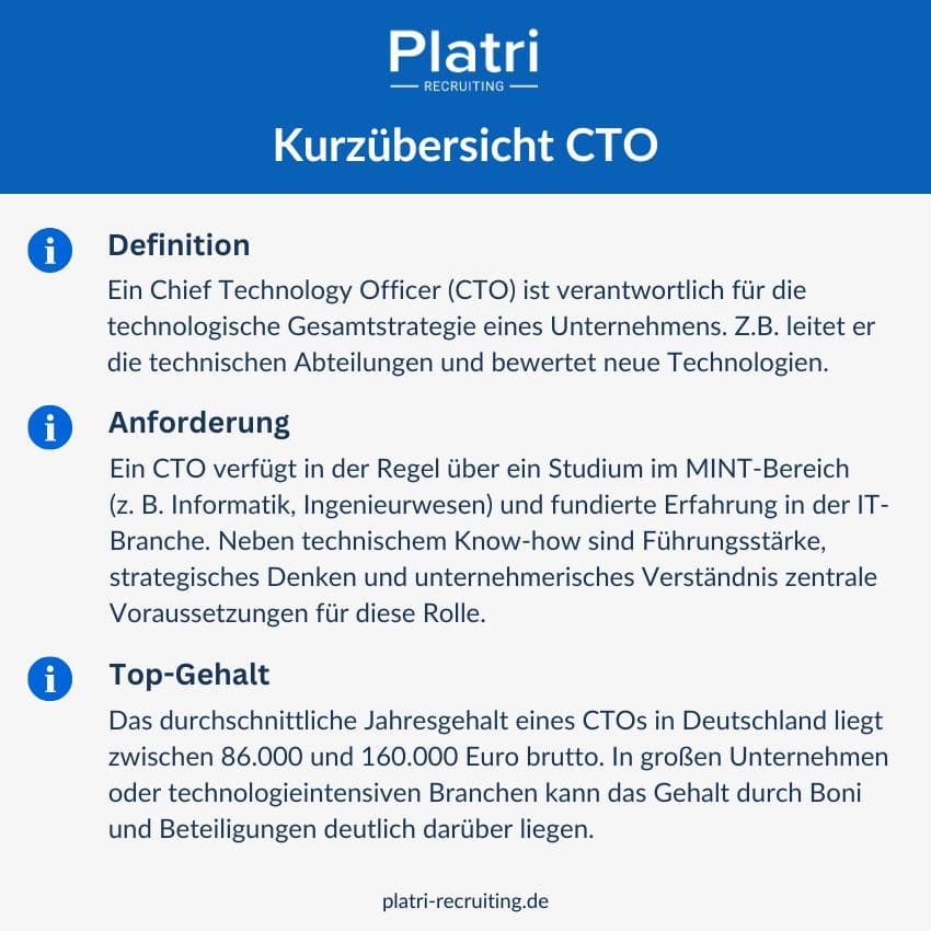 Ein CTO entwickelt die langfristige technologische Vision, identifiziert relevante Trends und Technologien und überführt diese in konkrete Unternehmensziele. Innerhalb des Unternehmens nimmt der CTO verschiedene strategische Rollen ein, die von der technischen Leitung bis zur Mitgestaltung der Unternehmensstrategie reichen. Insbesondere in technologiegetriebenen Branchen wie der Softwareentwicklung, dem Maschinenbau oder der Medizintechnik ist die Rolle des CTOs unverzichtbar.