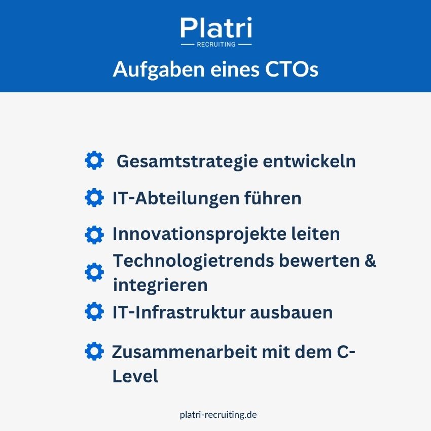 Führung der Entwicklungsabteilungen: CTOs leiten oft die Bereiche Softwareentwicklung, Systemarchitektur oder Produktentwicklung.
